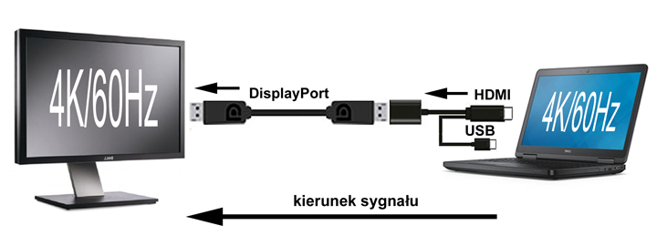 | Urządzenie działa tylko w jedną stronę: HDMI --> DisplayPort czyli przesyła sygnał od gniazda HDMI (np. laptop, komputer) do gniazda DisplayPort (np. monitor, rzutnik). | |||