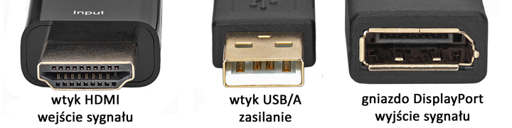 Konwerter zasilany jest z gniazda HDMI niemniej posiada również wtyk USB do dodatkowego zasilania w przypadku, gdy port HDMI nie posiada odpowiedniej wydajności prądowej (podczas naszych testów konwerter nie wymagał dodatkowego zasilania - podłączanie do gniazda USB nie było potrzebne). Konwerter zapewnia zgodność ze standardami DisplayPort 1.2 oraz HDMI 2.0, obsługuje szyfrowanie HDCP 1.4 i DPCP oraz zapewnia przesył cyfrowego sygnału dźwięku 8 kanałowego oraz obrazu o rozdzielczości 4Kx2K/60Hz. |